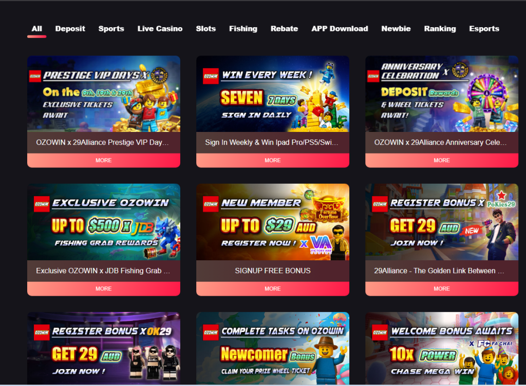 Promotions are a major part of the Ozowin experience. New and existing players can access several types of bonuses, including: